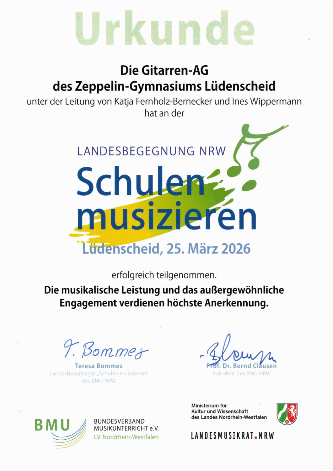 Unsere Gitarren-AG, geleitet von Frau Fernholz-Bernecker und Herrn Jaques, zeigte sich in den Räumlichkeiten der Musikschule der Stadt Lüdenscheid von ihrer besten Seite und sorgte – gemeinsam mit weiteren Ensembles und Chören aus Lünen, Herdecke, Herford, Werne und Verl – für ein abwechslungsreiches Programm.