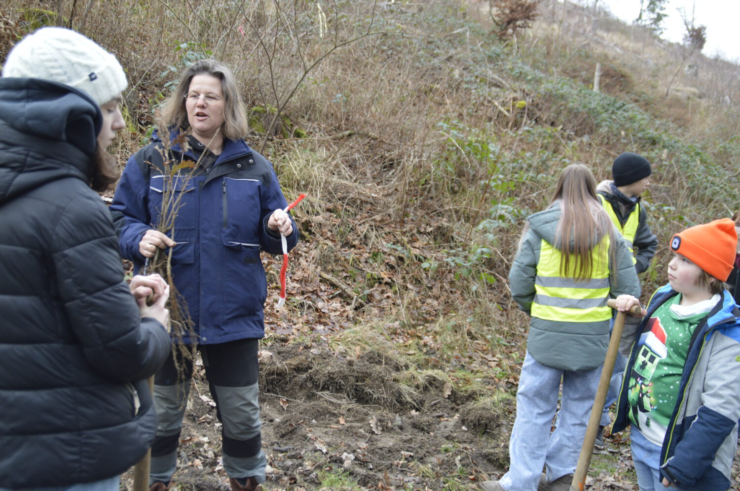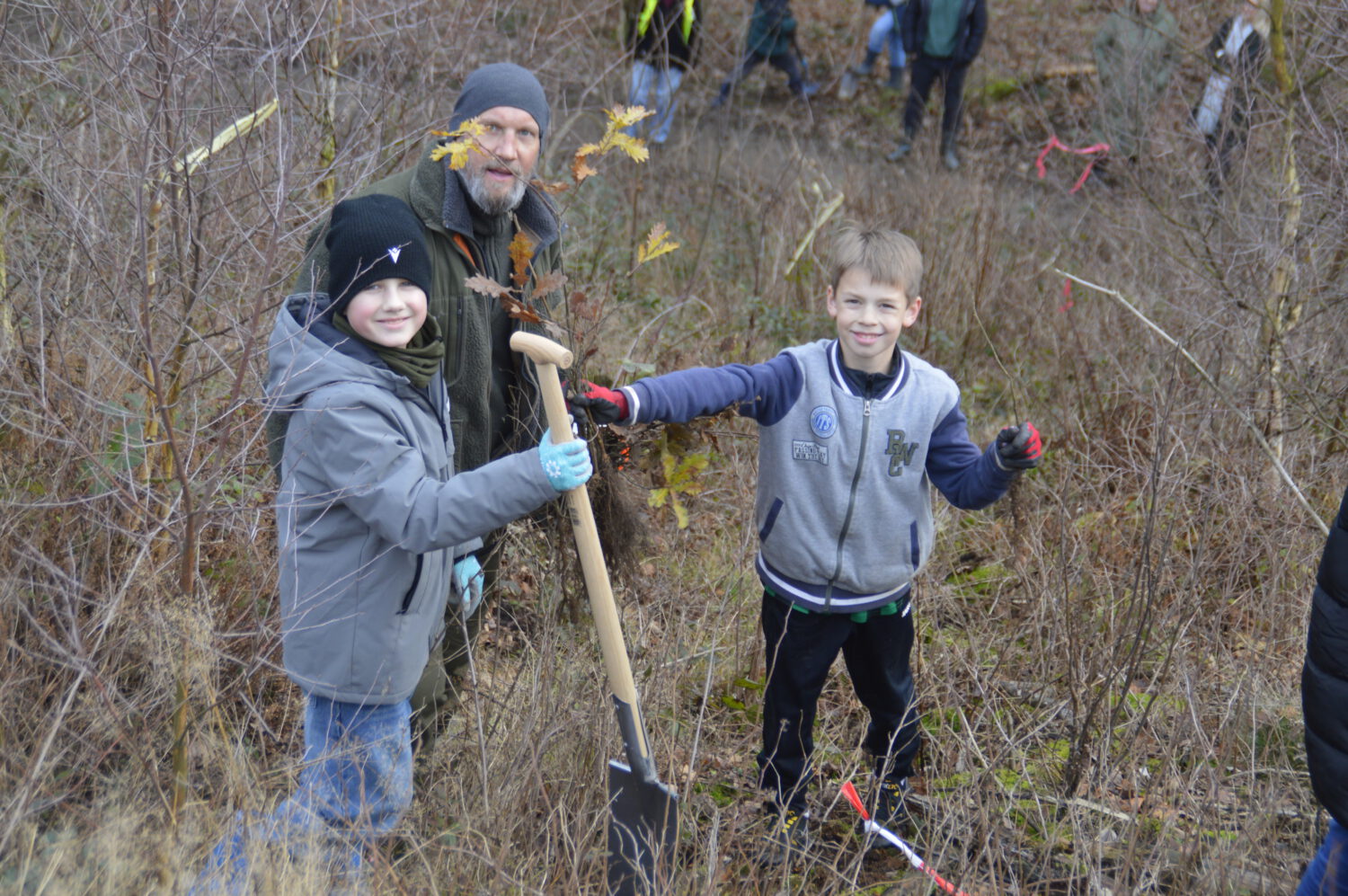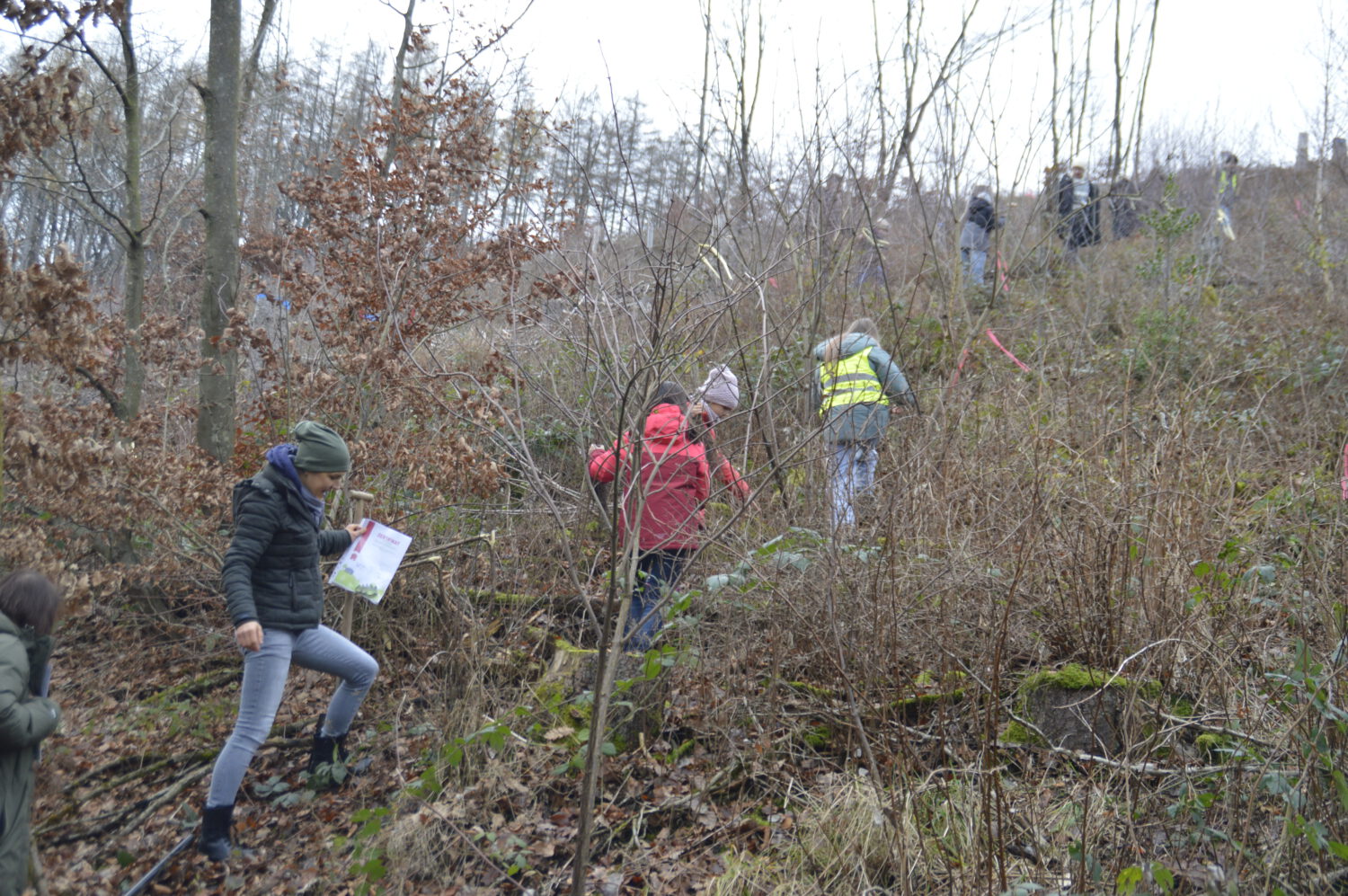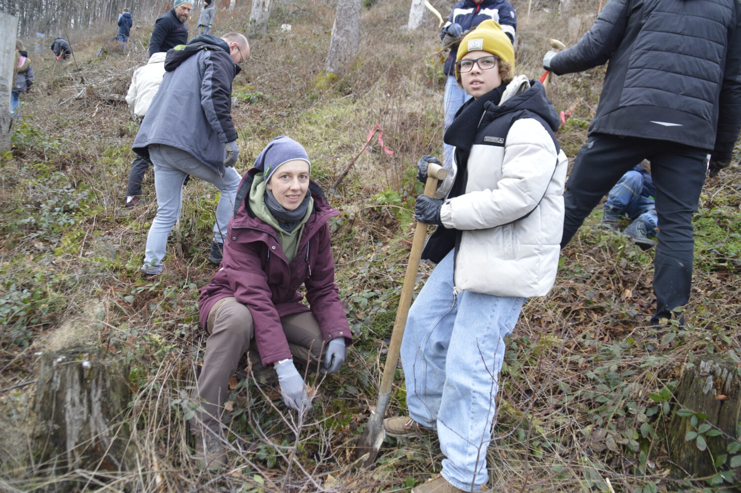 Gemeinsam mit der Schulwald-AG unter federführung von Frau Protzer organisierten Schülerinnen und Schüler, Eltern und Lehrkräfte eine bunte Pflanzaktion: Traubeneichen, Buchen, Vogelkirschen und Winterlinden fanden ein neues Zuhause auf der ehemaligen Kalamitätsfläche. Unterstützt wurde das Ganze vom Team des Naturschutzzentrums.