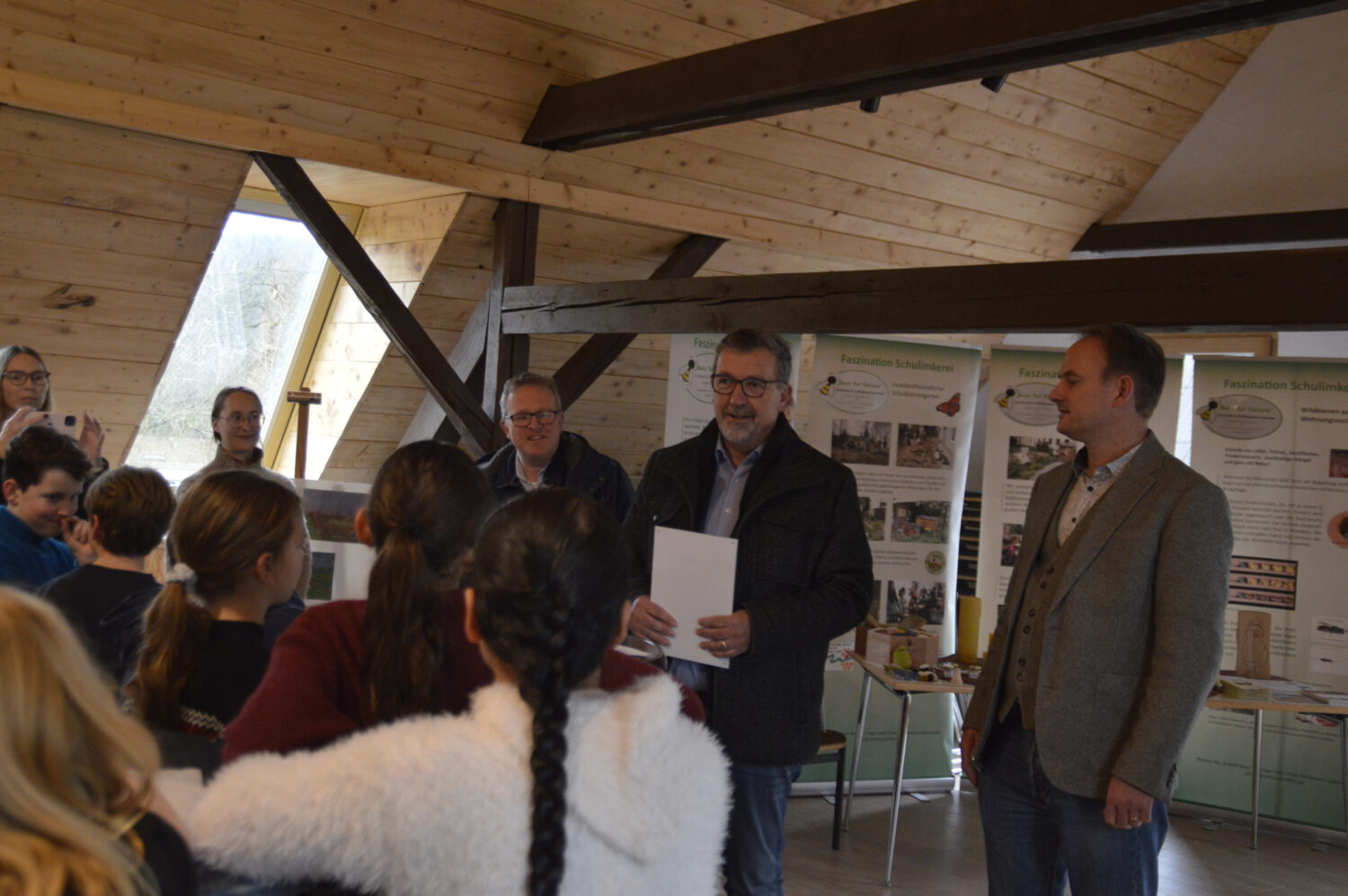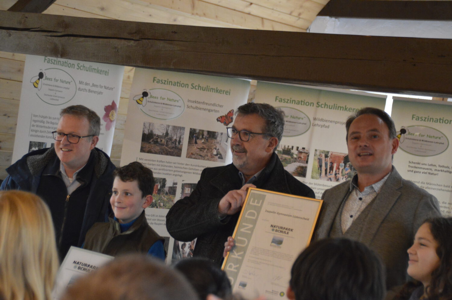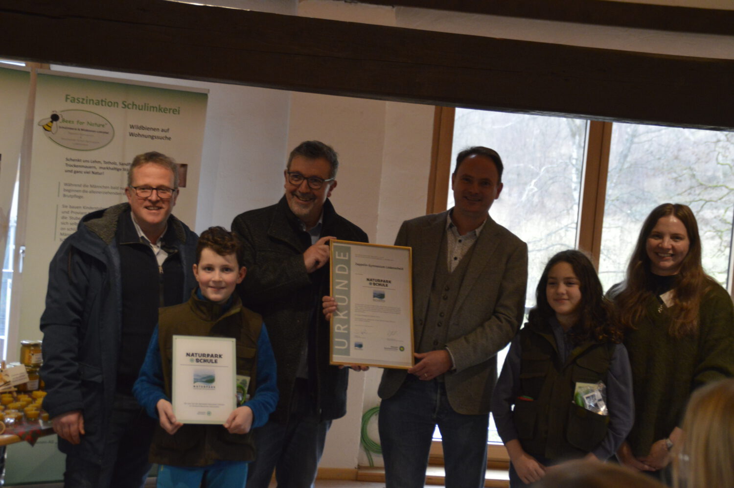 Zum Abschluss der Feierstunde übergaben Vertreter des Naturparks(Frau Woeste, Regionalmanagerin des MK, Herr Fuhrmann u. Herr Schmitz vom Verein Naturpark Sauerland-Rothaargebirge) feierlich das Zertifikat – und als kleines Highlight durften sich die Schülerinnen und Schüler über neue Entdeckerwesten freuen.