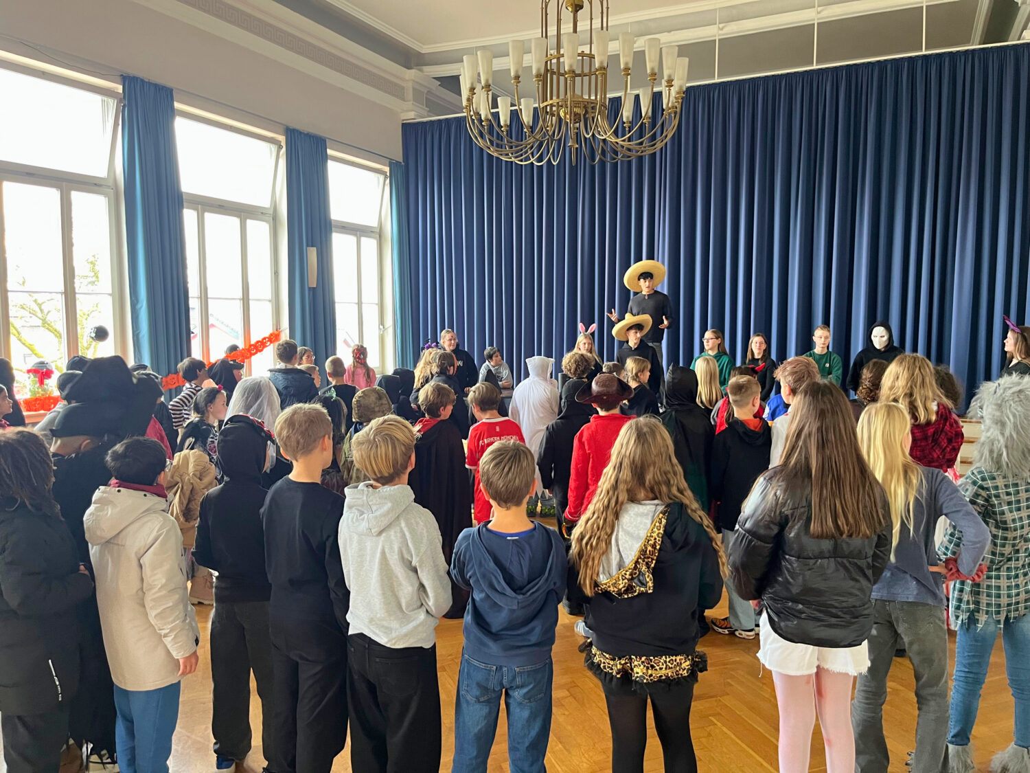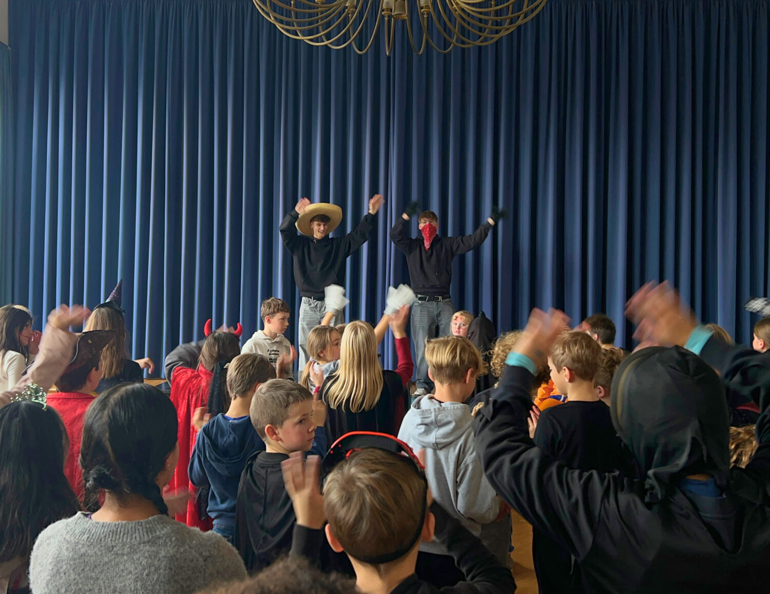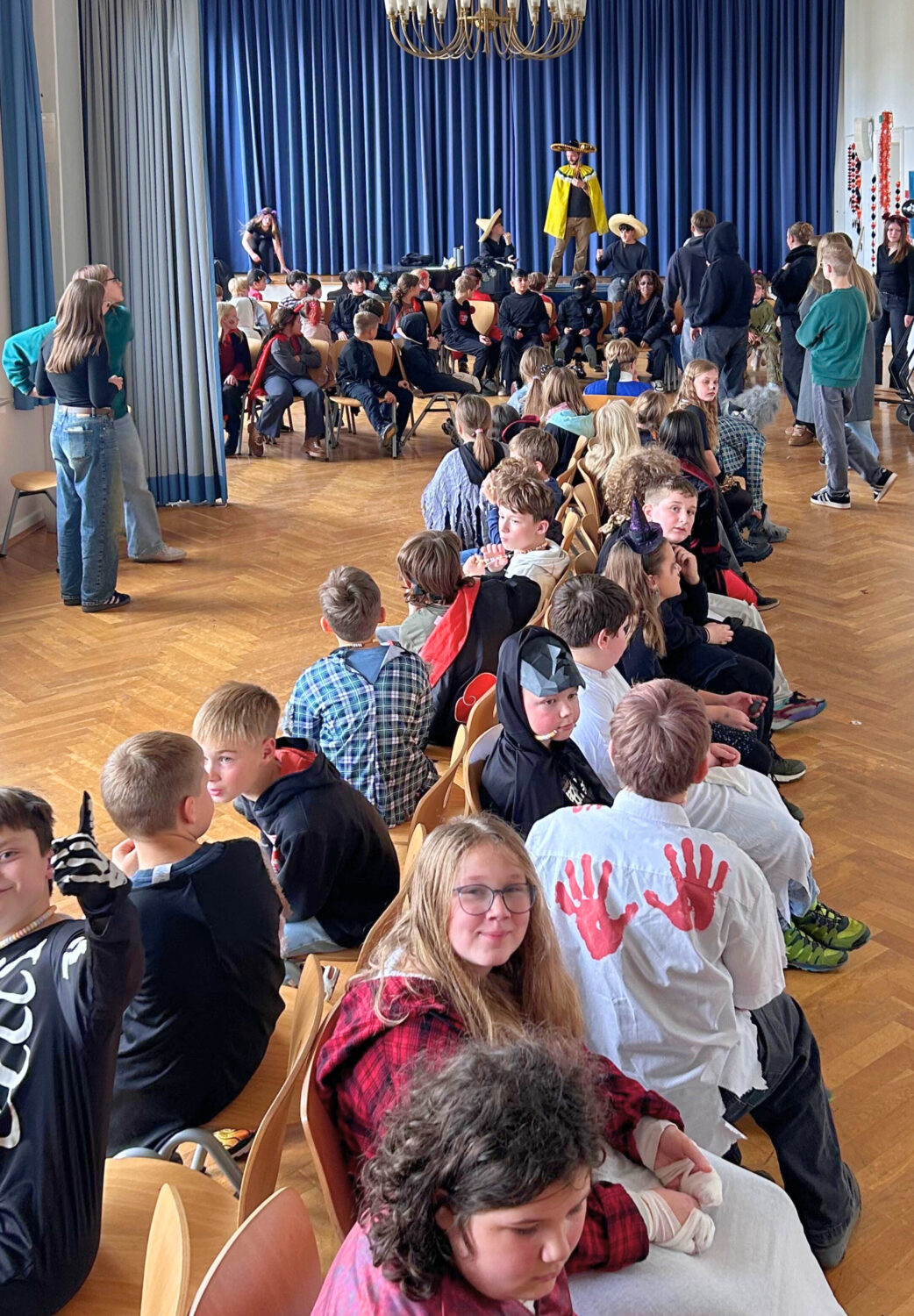Mit viel Engagement und Kreativität hatte unsere SV ein buntes Programm vorbereitet. Besonders beliebt war das Spiel „Reise nach Transsilvanien“, bei dem Vampire, Hexen und Gespenster lautstark angefeuert um die Wette reisten und jede Menge Spaß hatten. Auch beim Kostümwettbewerb und weiteren Spielen war die Stimmung ausgelassen und eine Polonaise aus strahlend-gruseligen Gesichtern verließ die Aula am Ende.