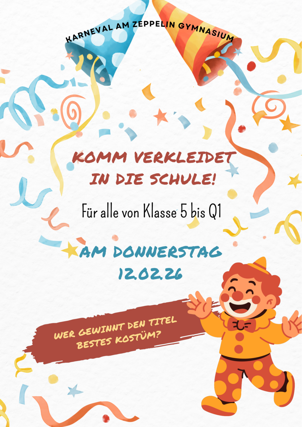 An Weiberfastnacht (Donnerstag, den 12.02.2026) wird es bunt am Zeppelin-Gymnasium. Wir laden alle Schülerinnen und Schüler, Lehrerinnen und Lehrer, Hausmeisterinnen und Hausmeister sowie alle Mitarbeitenden ein, verkleidet in die Schule zu kommen. Egal ob klassische Verkleidung, kleine rote Pappnase oder kreative Kostüme, Gruppen- oder Themenkostüme. ALLES ist erlaubt, man muss nur auf Waffen und Vollmaskierung verzichten.